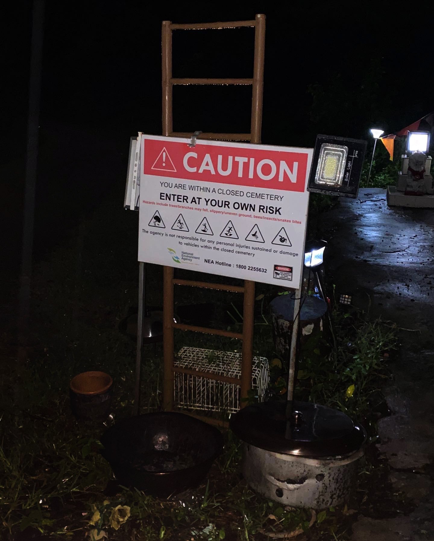 After a few attempts, we stumbled upon our desired destination—an abandoned cemetery. (Bukit Brown Cemetery, Singapore) The gate beckoned us forward, bearing a sign that read, "Abandoned Cemetery: Enter at Your Own Risk." 🚫 An intoxicating mix of excitement and trepidation filled the air as we crossed the threshold into the velvety darkness.
