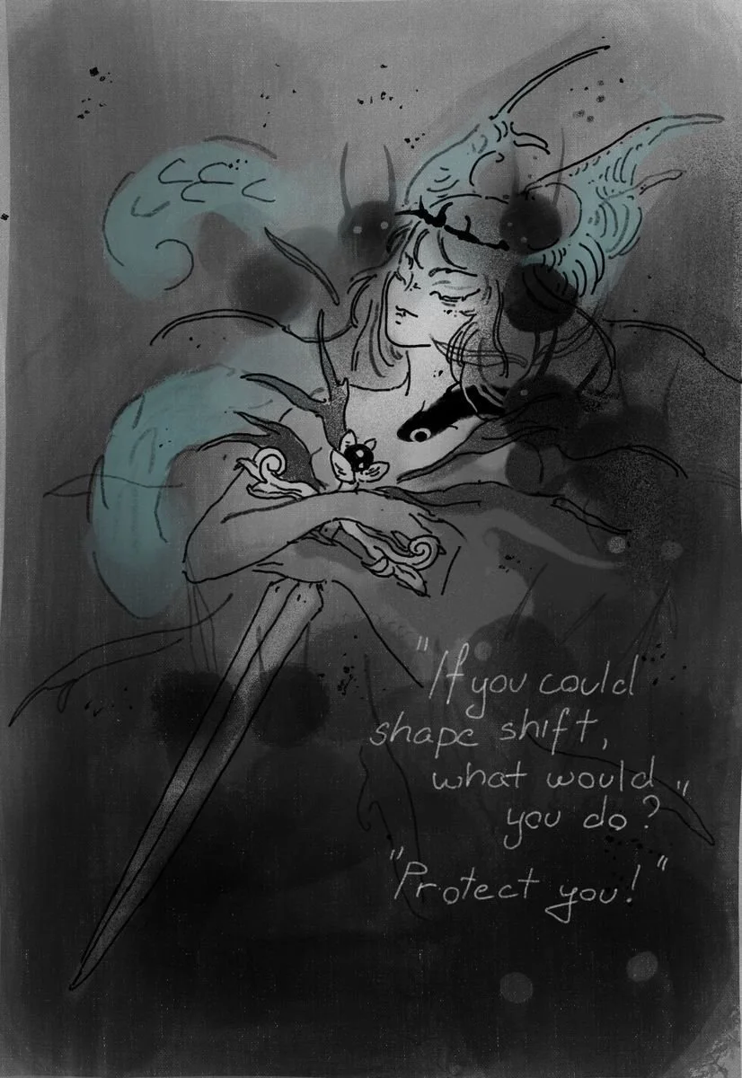 This obsession occasionally led to trouble. One particularly memorable incident began when Coalby stumbled across Emha’s personal notebook. Mistaking it for a spellbook, he became convinced that Emha was secretly keeping the solution to his problem hidden from him. Among her many sketches and sigils, he found one that caught his attention—a design meant to temporarily give shadow spirits a human-like silhouette. The sigil was one of Emha’s playful creations, something she had drawn up in her spare time for harmless experimentation, but Coalby thought it was the key to his transformation.