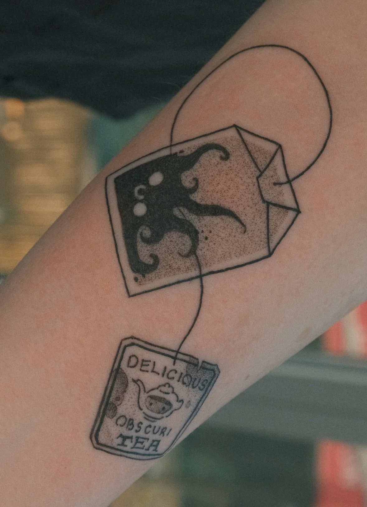 The Obscuritea Tea Bag is one of my signature tattoo designs from the Haunted Tea House.