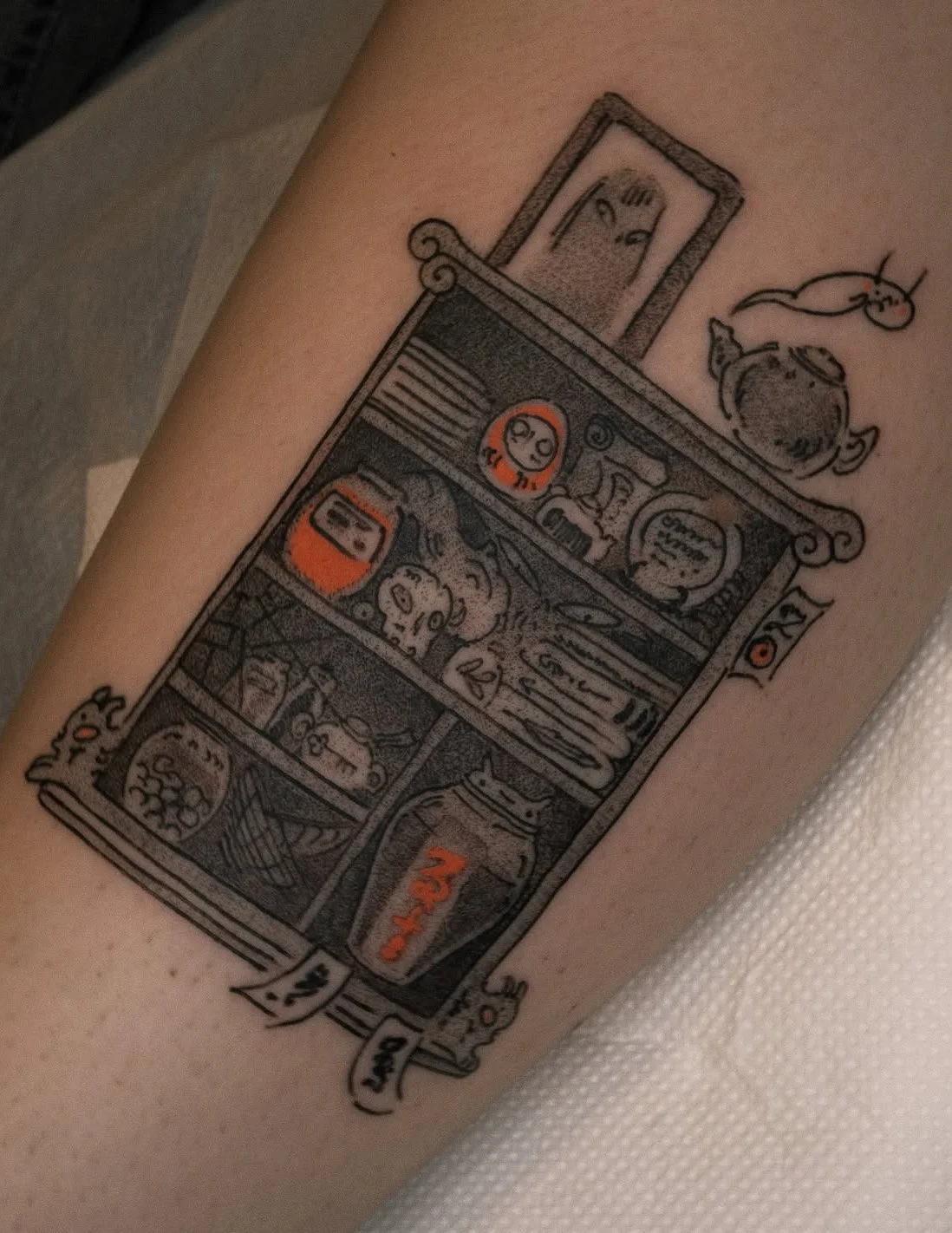 You can ask me to create a shelf tattoo and either leave the entire design to my imagination, or suggest specific items or a theme for me to build around.