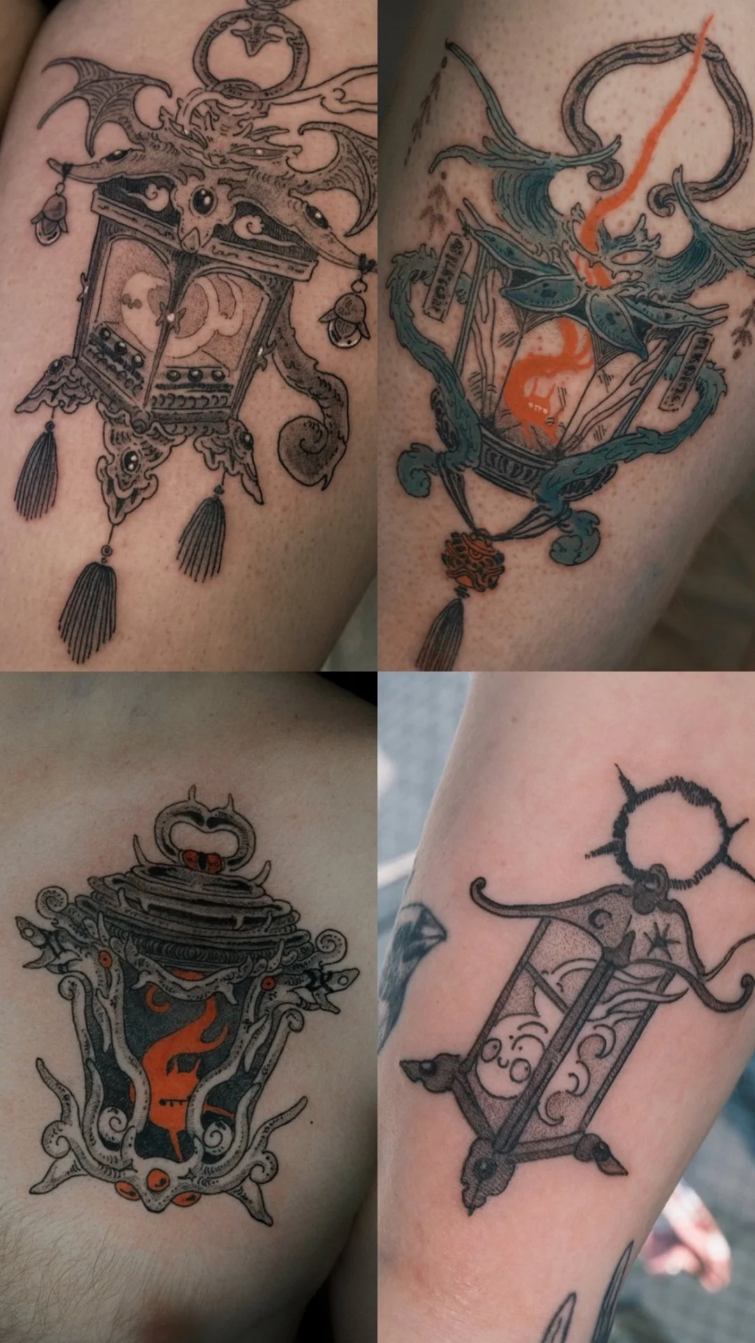 Lantern tattoos can appear calm and guiding or slightly unsettling, depending on how the Shadow Spirit inhabits them. They work beautifully as standalone pieces or paired with other Haunted Tea House creatures such as moths, dragons and felines.